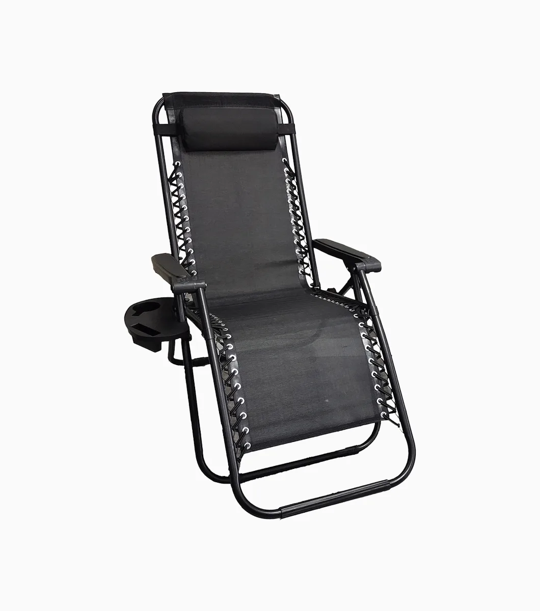 დასაკეცი სკამ-შეზლონგი PVC ტექსლინის ზედაპირით – ბალიშით და ჭიქის დასადებით